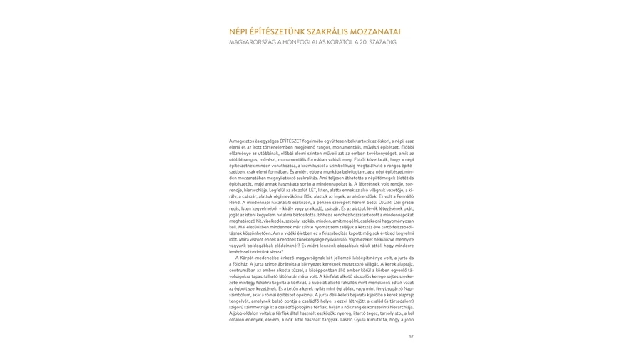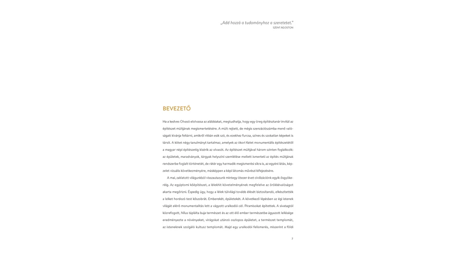 A kötet négy tanulmányt tartalmaz, amelyek az ókori Kelet monumentális építészetétől a magyar népi építészetig kísérik az olvasót. Az építészet múltjával három szinten foglalkozik: az épületek, maradványok, tárgyak helyszíni szemlélése mellett ismerteti az építés múltjának rendszerbe foglalt történetét, de rátér egy harmadik megismerési síkra is, az egyéni látás, képzelet vizuális következményére, másképpen a képi látomás művészi kifejezésére. Mindezt a legszakavatottabbtól, Istvánfi Gyula építészprofesszortól kapjuk, aki évtizedekig kutatta és tanította az őskort és a népi építészetet. A mai, zaklatott világunkból visszautazunk mintegy ötezer évet civilizációnk egyik ősgyökeréig.