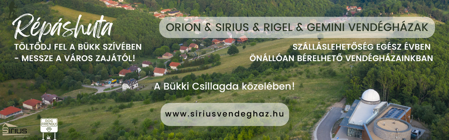 Szeretnénk átadni azt az életérzést, amit a csodálatos Bükk hegység és vidéke nyújt. Ha maga mögött hagyná a városi zajt és forgatagot, látogasson el hozzánk, Répáshuta olyan, akár egy mesebeli falu, a Bükk hegység völgyében fekszik és körülöleli az erdő, mely nyugodt, pihentető atmoszférát teremt. A Bükk és benne Répáshuta kristálytiszta levegőjével, csodálatos környezetével nemcsak a gondtalan pihenés lehetőségét kínálja, a Bükki Nemzeti Park vidéke számtalan emlékezetes kirándulásra, kiváló túrára nyújt lehetőséget.2022 nyarán játszóteret és parkolót alakítottunk ki Vendégeinknek, mely közvetlenül az Orion vendégház mellett, a Sirius vendégháztól pedig pár lépésre található.